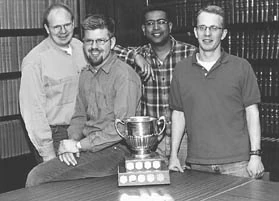 “Mooters Marvin Klassen, Tyson Dahlem, Sandeep Dhir, and Will Clements with the Malcolm M. MacIntyre Memorial Cup. Missing from the photograph: coach Bill Roe. First place, followed by a second place at the Sopinka Moot, with only five weeks of practice.”